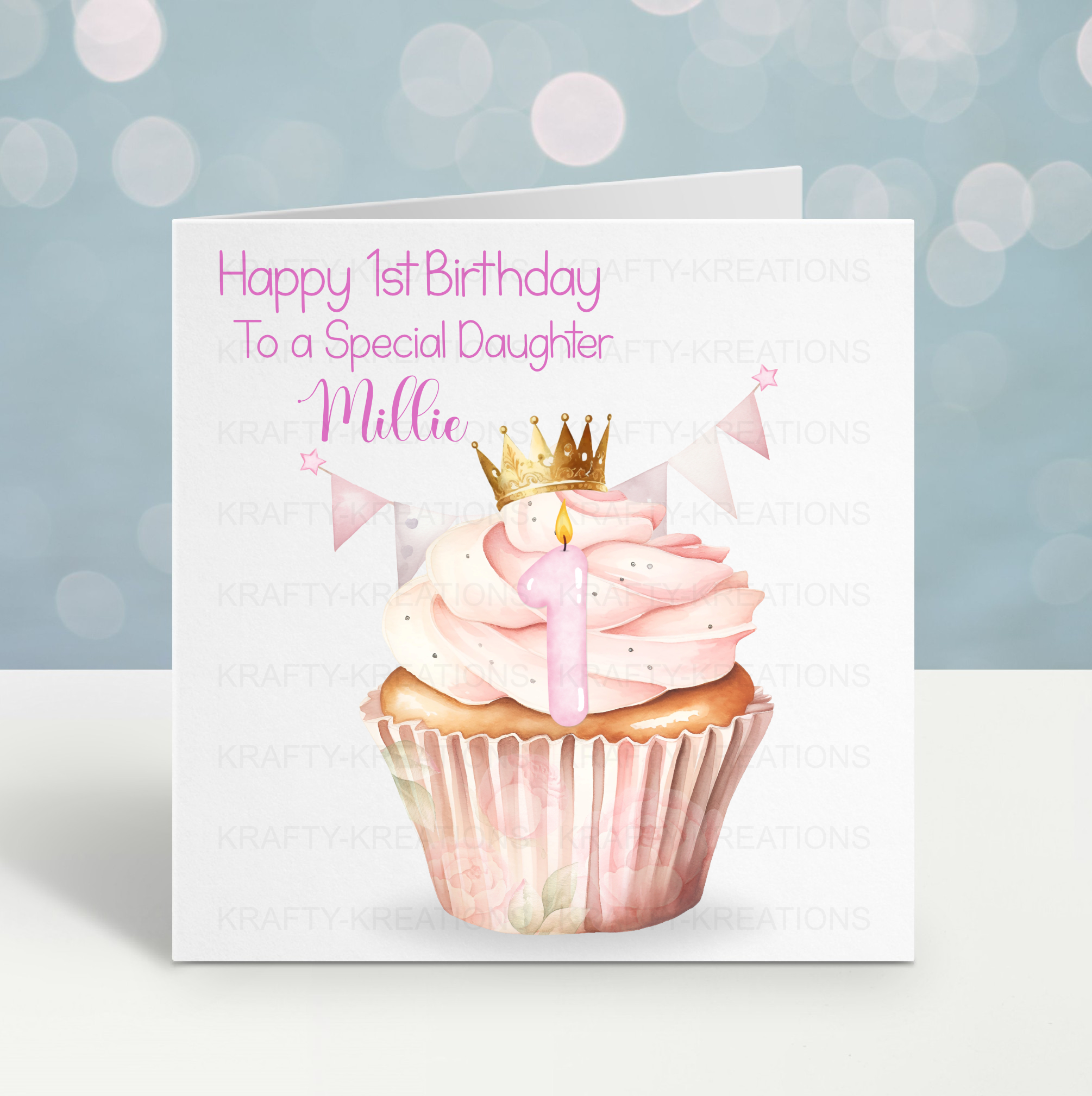 Make their birthday extra special with this pink cupcake birthday card. The playful design shows a bright pink cupcake topped with a number candle and a sparkling crown. Choose any age from 1 to 9, and add a name and relation to create a one-of-a-kind keepsake.